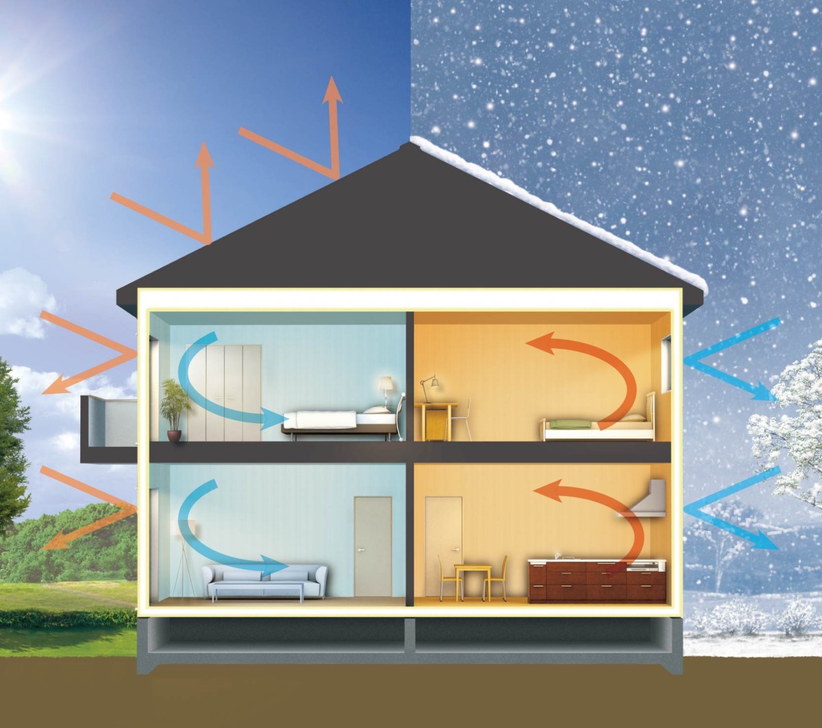 高気密高断熱な家づくりにより、外のジメジメが室内に入ってくるのをシャットアウトし、同時に、除湿した室内の空気が外に逃げるのも防ぎます。
