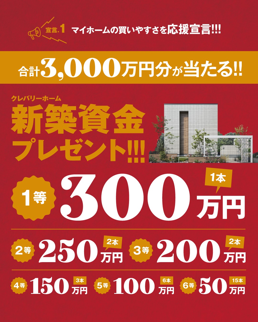 クレバリーホームでは、総額3,000万円分の建築資金が抽選で当たるプレゼント企画を実施しています。