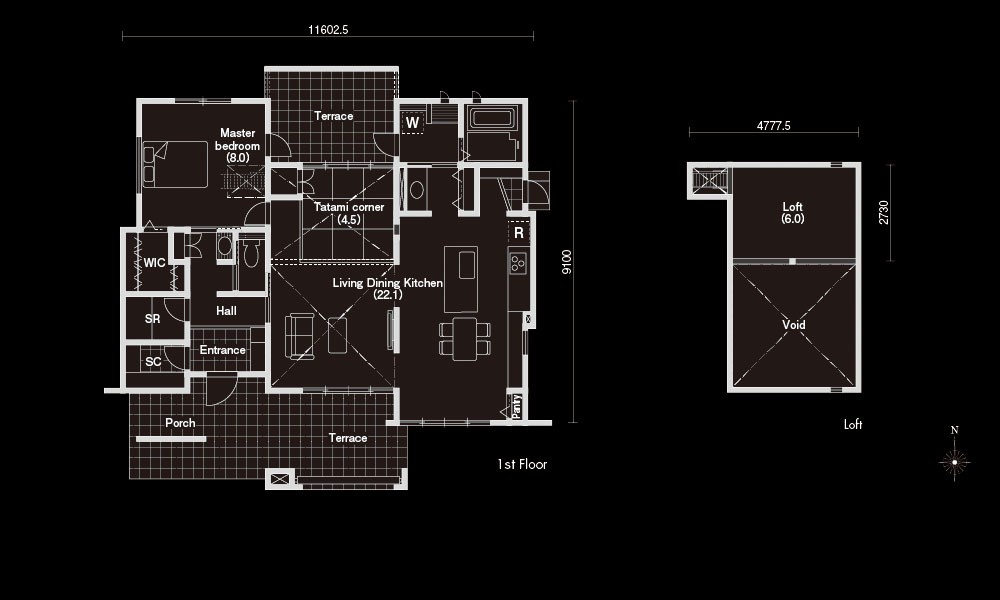 リビングの上部が吹き抜けになっている開放的な平屋の間取りです。玄関周辺にはシューズクローゼットや、書斎に最適なサービスルームを完備。主寝室にはウォークインクローゼットのほか、高い天井を活用したロフトもあるので、収納に困ることはなさそうです。南北のテラス、視界が開けるアイランドキッチンなど、開放感を重視したい方にぴったりのプランです。