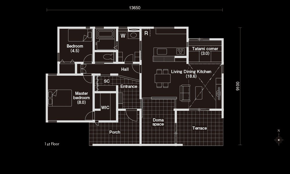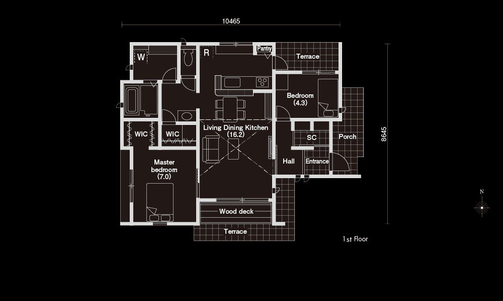 十字上にテラスや大開口の窓を設け、四隅に居住スペースを配置した平屋の間取りです。各スペースの間には、必ず緩衝帯となる空間があるので、同じ家にいてもお互いのプライバシーをしっかり守れます。ランドリースペースからテラスへ直接出られるようになっていて、洗濯物を外干しする手間もかかりません。