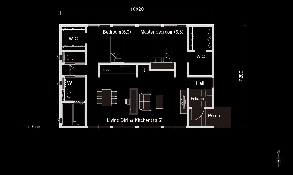 こちらの間取りの特徴は、北側のスペースを仕切って2つの個室として使える点です。夫婦2人の共用スペースとして広く使っても、中央に仕切りを設けてそれぞれの個室として使ってもいいでしょう。ウォークインクローゼットも左右それぞれにあるので、多趣味な夫婦にもぴったり。一人の時間も二人の時間も充実させられる間取りです。